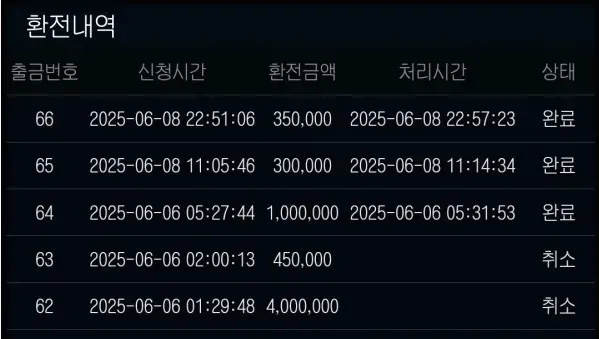 근래에 제 배팅방식이 잘못됫다고 2달만에 환전치는데 바로 거절당하고 원금 처리 당했습니다.